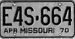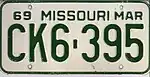 1969 Embossed black serial on white plate with border line; month of expiration, "MISSOURI" and "70" at bottom none A1B-234 First letter corresponds to month of expiration