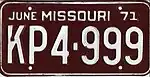 1970 Embossed white serial on maroon plate with border line; month of expiration, "MISSOURI" and "71" at top none AB1-234 First letter corresponds to month of expiration