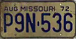 1971 Embossed blue serial on reflective white plate with border line; month of expiration, "MISSOURI" and "72" at top none A1B-234 First letter corresponds to month of expiration