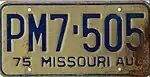 1975 Embossed reflective (glass-beaded) yellow serial on blue plate with border line; month of expiration, "MISSOURI" and "76" at top none A1B-234 First letter corresponds to month of expiration