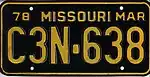1977 Embossed reflective (glass-beaded) yellow serial on black plate with border line; "78", "MISSOURI" and month of expiration at top none A1B-234 First letter corresponds to month of expiration