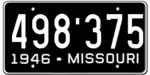 1946 Embossed white serial on black plate with border line; "1946-MISSOURI" at bottom 123-456 1 to approximately 774-000