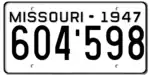 1947 Embossed black serial on white plate with border line; "MISSOURI-1947" at top 123-456 1 to approximately 828-000