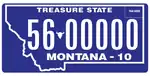 2010–present Screened white serial with buffalo skull separator on reflective blue plate with white state-shaped border; "MONTANA - 10" screened in white centered below serial "TREASURE STATE" screened in white centered at top 1-12345A