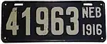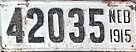 The U.S. state of Nebraska first required its residents to register their motor vehicles in 1905. Registrants provided their own license plates for display until 1915, when the state began to issue plates.[1]