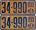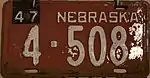 - ↑ "Old Nebraska License Plates". LeatherLicensePlates.com. Retrieved May 25, 2017.