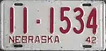 1942–44 | Red on white; "NEBRASKA 42" at bottom | none | 1-12345 10-1234 |