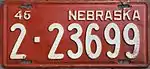 1946–47 | White on brick red; "46 NEBRASKA" at top | none | 1-12345 10-12345 |