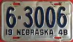 1948 | Dark blue on unpainted aluminum; "19 NEBRASKA 48" at bottom | none | 1-12345 10-12345 |