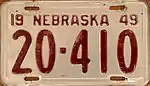1949 | Maroon on unpainted aluminum; "19 NEBRASKA 49" at top | none | 1-12345 10-12345 |
