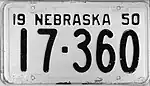 1950 | Dark blue on white; "19 NEBRASKA 50" at top | none | 1-12345 10-12345 |