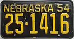 1954 | Golden yellow on black; "NEBRASKA 54" at top | none | 1-12345 10-12345 |