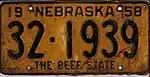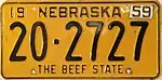 1958–59 | Black on golden yellow with border line; "19 NEBRASKA 58" at top | The Beef State | 1-123456 10-12345 |
