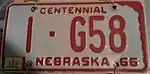 Coded by county of issuance (1 or 10) | Commemorated Nebraska's 100 years of statehood. Letters I, M, O, Q, W and X not used in serials; this practice continues today (except in Douglas, Lancaster and Sarpy Counties since 2002).[3] Revalidated for 1967 and 1968 with stickers. |