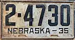 1935 | Black on gray; "NEBRASKA – 35" at bottom | none | 1-12345 10-1234 |