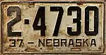 1937 | Black on gray; "37 – NEBRASKA" at bottom | none | 1-12345 10-1234 |