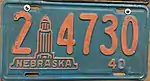 1940 | Orange on turquoise with State Capitol graphic; "NEBRASKA 40" at bottom | none | 1-12345 10-1234 |