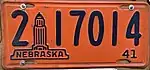 1941 | Dark blue on orange with State Capitol graphic; "NEBRASKA 41" at bottom | none | 1-12345 10-1234 |