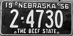 1956 | White on black with border line; "19 NEBRASKA 56" at top | The Beef State | 1-123456 10-12345 |