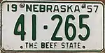 1957 | Green on white with border line; "19 NEBRASKA 57" at top | The Beef State | 1-123456 10-12345 |