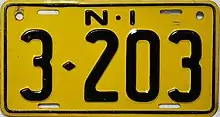 Prior to the 1961 adaption of the current format, hand painted plates were issued. After 1961, NI started to use Australian standard dies plates in black on yellow and the format are all numeric for vehicles and motorbikes in C-123 format. Administrative vehicles are issued in Red A and black on white base in numerics shown as A-123 and motorcycles A C-12.