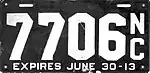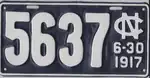 1913 | White serial on black porcelain plate; vertical "NC" at right and "EXPIRES JUNE 30-13" at bottom | none | 1234 | 6801 to approximately 8000 | Issued only to new registrants from April 1 through June 30, 1913, with serials following on from those on pre-state-issued plates.[3] |