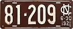 1920–21 | Embossed white serial on brown plate; white lines at top and bottom borders; "NC" monogram and "6-30 1921" at right | none | 123-456 | 1 to approximately 131-000 | |