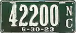 1922–23 | Embossed white serial on green plate with border line; vertical "NC" at right and "6-30-23" centered at bottom | none | 123456 | 1 to approximately 181000 | |