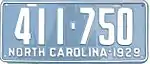 1929 | Embossed white serial on sky blue plate with border line; "NORTH CAROLINA-1929" at bottom | none | 123-456 | 100-001 to approximately 580-000 | First use of the full state name. Horsepower classes same as 1926–28 but no letter used for the 25 hp and under class; for the other classes, the letter was carried at the right of the plate. This happened again in 1930. |