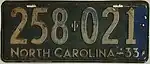 1933 | Embossed white serial on dark blue plate; "NORTH CAROLINA–33" at bottom | none | 123-456 | 100-001 to approximately 464-000 | |