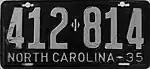 1935 | Embossed silver serial on black plate; "NORTH CAROLINA–35" at bottom | none | 123-456 | 100-001 to approximately 518-000 | |