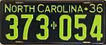 1936 | Embossed light green serial on black plate; "NORTH CAROLINA–36" at top | none | 123-456 | 100-001 to approximately 545-000 | |