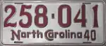 1940 | Embossed maroon serial on silver plate; "North Carolina 40" centered at bottom | none | 123-456 | 200-001 to approximately 705-000 | |