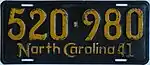 1941 | Embossed golden yellow serial on black plate; "North Carolina 41" centered at bottom | none | 123-456 | 200-001 to approximately 775-000 | |