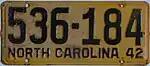 1942–43 | Embossed black serial on golden yellow plate; "NORTH CAROLINA 42" at bottom | none | 123-456 | 200-001 to approximately 762-000 | Revalidated for 1943 with black tabs, due to metal conservation for World War II. |