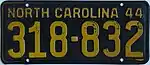 1944 | Embossed golden yellow serial on black plate; "NORTH CAROLINA 44" at top | none | 123-456 | 200-001 to approximately 707-000 | |