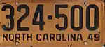 1949 | Embossed black serial on golden yellow plate; "NORTH CAROLINA 49" at bottom | none | 123-456 | 100-001 to 800-000 | From the personal collection of Richard Watson. |