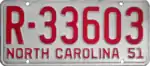 1951 | Embossed red serial on white plate; "NORTH CAROLINA 51" at bottom | none | 123-456 | 100-001 to 760-000 |