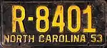 1953 | Embossed golden yellow serial on black plate; "NORTH CAROLINA 53" or "N.C.", slogan and "53" at bottom (see right) | none, or "DRIVE SAFELY" between state abbreviation and year | 123-456 | 100-001 to 760-000 |
