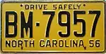 1956 | Embossed black serial on golden yellow plate with border line; "NORTH CAROLINA 56" at bottom | "DRIVE SAFELY" centered at top | A-1234 AB-1234 |