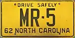 1962 | As 1956 base, but with "62 NORTH CAROLINA" at bottom | "DRIVE SAFELY" as on 1956 base | A-1234 AB-1234 |