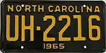 1965 | Embossed golden yellow serial on black plate; "NORTH CAROLINA" at top; "1965" centered at bottom | none | A-1234 AB-1234 |