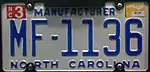 Manufacturer | Embossed blue on white with border line; "NORTH CAROLINA" at bottom; "MANUFACTURER" at top | MF-1234 | MF-1001 to present | ||