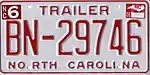 Trailer | 1995–present | Embossed red on white with border line; "NORTH CAROLINA" at bottom; "TRAILER" at top | AB-12345 | AN-10000 to AX-99999; BA-10000 to present |