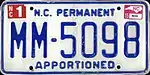 Apportioned Truck | 2006–present | Embossed blue on white with border line; "N.C. PERMANENT" at top; "APPORTIONED" at bottom | LB-1234 MB-1234 NB-1234 |