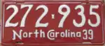 1939 | Embossed silver serial on maroon plate; "North Carolina 39" centered at bottom | none | 123-456 | 200-001 to approximately 686-000 | |