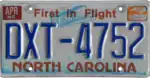 April 2007 – October 2009 | Red on reflective white with light blue Wright Flyer graphic | "First in Flight" as above | ABC-1234 | WTF-1976 to approximately ZND-9999 | Mainly issued as replacements for earlier "First in Flight" plates with the ABC-123 and ABC-12 serial formats, plus the ABC-1234 format up to JZZ-9999.[5] |