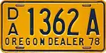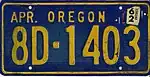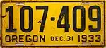 July 1 – December 31, 1933 Embossed black serial on golden yellow plate with border line; "OREGON DEC. 31 1933" at bottom 123-456 1 to approximately 218-000