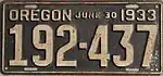 Embossed white serial on black plate with border line; "OREGON JUNE 30 1933" at top 123-456 1 to approximately 250-000