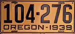 1939 Embossed black serial on yellow plate with border line; "OREGON-1939" at bottom 123-456 1 to approximately 344-000